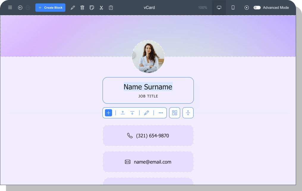 Add links, buttons, text, images, contacts, and social icons in seconds. Everything is already structured for you.
